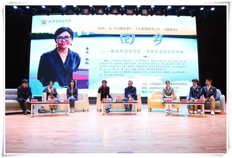 11月10日,江蘇省清江中學(xué)在千人報告廳舉行了以“回鄉(xiāng)”為話題的魏微和淮安作家、清中學(xué)生的文學(xué)對話座談會。本次活動由蔡正鵬副校長主持,人民文學(xué)出版社編輯樊曉哲女士,淮安市作協(xié)主席龔正先生,淮安市作協(xié)顧問劉季女士,江蘇省清江中學(xué)喬中云校長,崔玉老師,清泉文學(xué)社學(xué)生代表趙元皓、唐貞恬兩位同學(xué)及淮安作協(xié)的部分作家、高二全體同學(xué)參加了這次座談會。